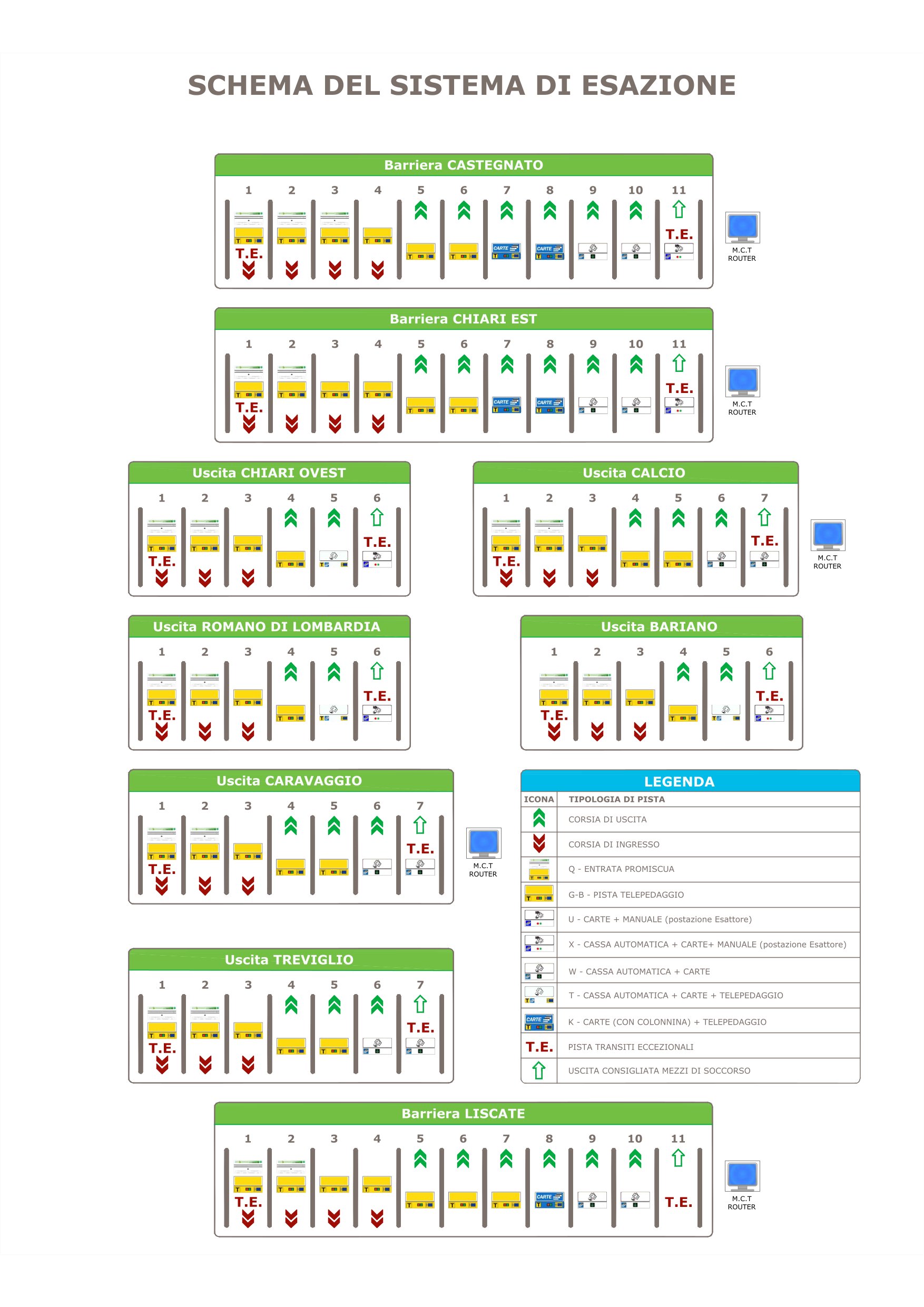 Il Cliente che ha percorso la A35, può facilmente individuare le corsie ove procedere al pagamento con la forma desiderata (elettronica o contanti) grazie alla presenza di una segnaletica chiara ed esplicita, orizzontale e verticale, contraddistinta da diversi colori di fondo. Eccoli rappresentati in abbinamento alle specifiche modalità di pagamento: